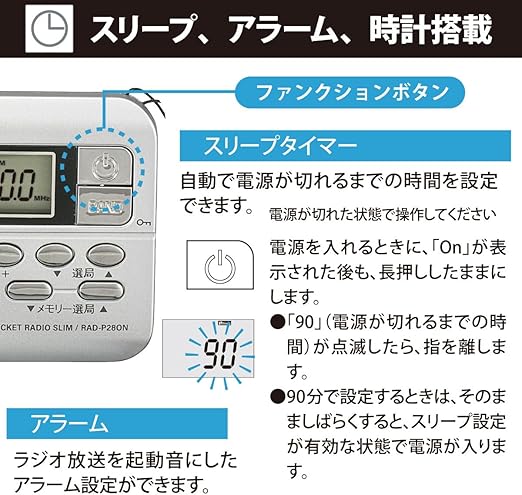 ◆スリープ、アラーム機能付きデジタル時計搭載 ◆FMステレオ受信 ※ステレオイヤホン使用時 ◆ステレオイヤホン付属 ◆スピーカー搭載 ◆FMロッドアンテナ搭載 ◆誤動作防止(HOLD)機能付き ◆便利なスタンド機能(スタンド用リング付きストラップ付き) ◆家庭用電源で使えるDC IN端子搭載(AC電源アダプター別売)