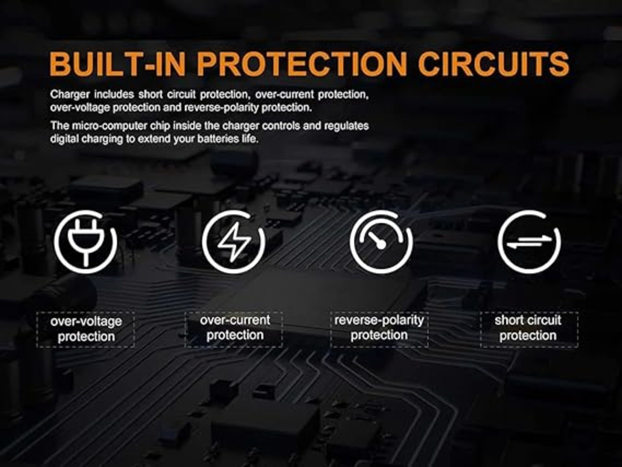 短絡(ショート)、過電流、過電圧、逆接続を防ぐ多重保護回路を内蔵しています。