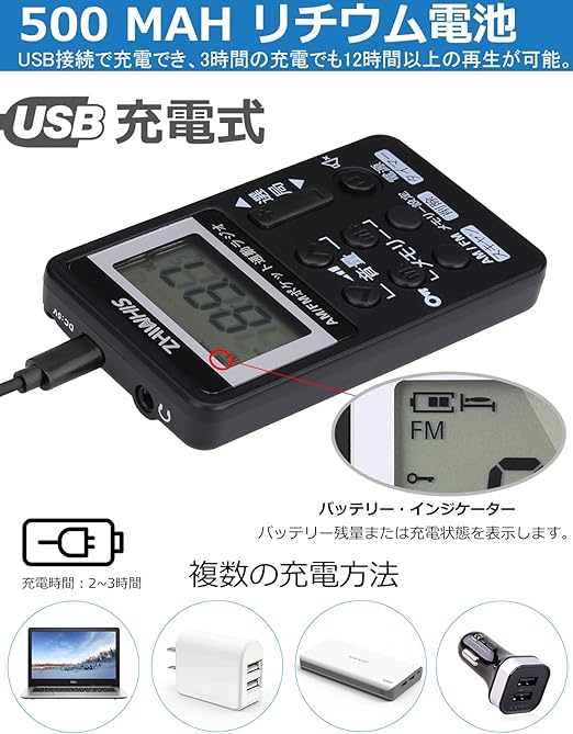 ZHIWHIS 携帯ラジオ 小型充電式 タイマー/デジタル時計付き AM/FM/ワイドFM対応 DSP高感度ステレオ受信機 キーロックとプリセット機能付き 防災 通勤 旅行 運動用 日本語取説&保証書付き 黒 ZWS-103 a | PCBASE