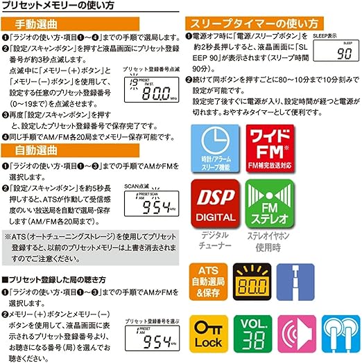 音量もデジタル表示 AM/FM各20局を自動でメモリーできる自動選局&保存機能付 時計・アラーム・スリープ機能付 ワイドFM対応 FMロッドアンテナ付 誤作動防止ロック機能付 スピーカー搭載・ステレオイヤホン付属