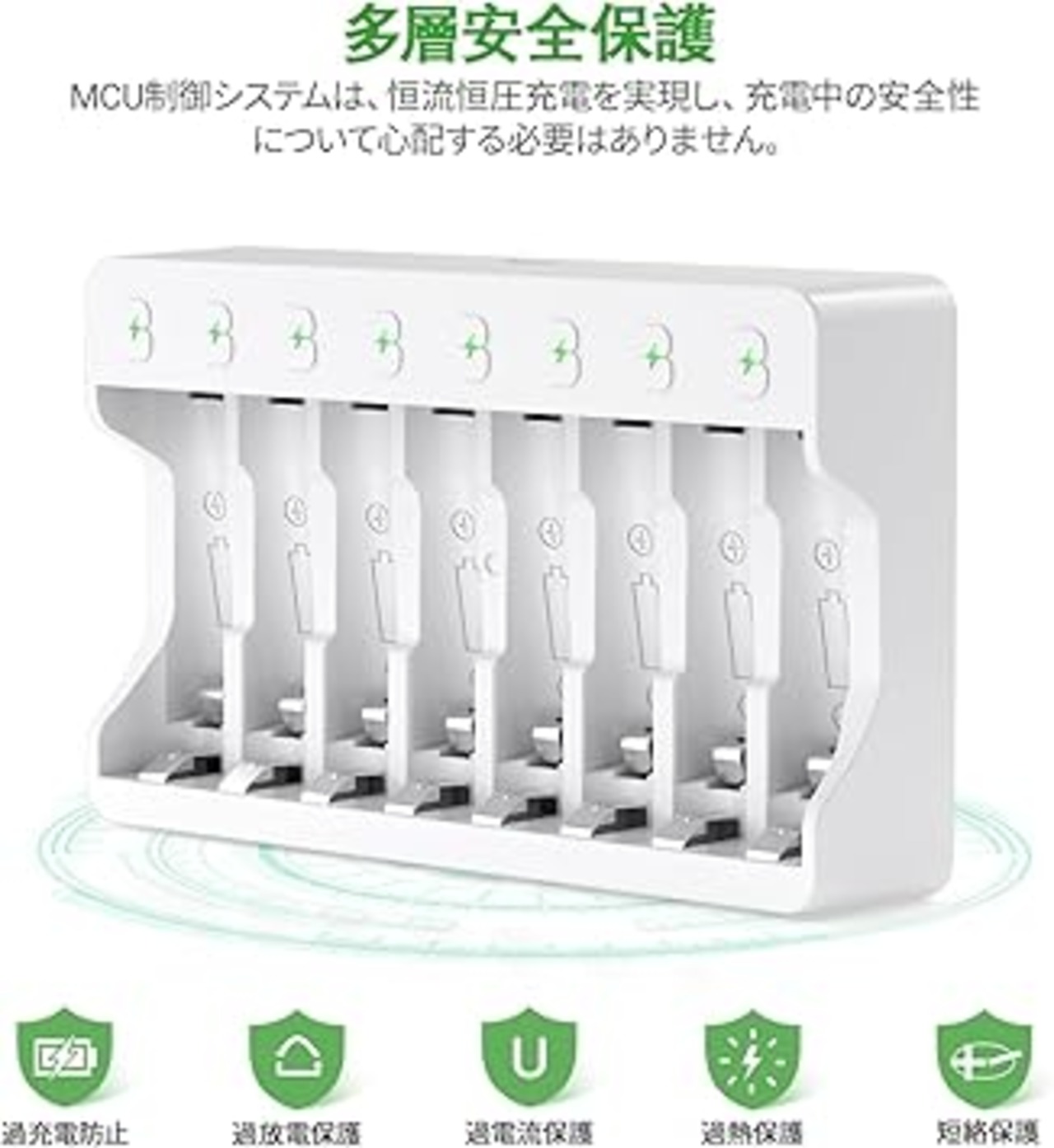 【電池充電器セット】充電電池充電器の特徴:8スロット独立充電、2800mAhじゅうでんち単3*4本と1100mAh電池 単4 充電式*4本、電池収納ケース、USB-Cケーブル、説明書が入っています。