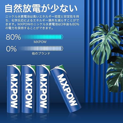 【長期保存可能】低自己放電技術を採用しており、保存期間中に一年経っても電池残量は85%以上を維持。※自己放電特性[容量残存率]は電池機種により異なります。また、環境温度が変化することで残存率は変化します。