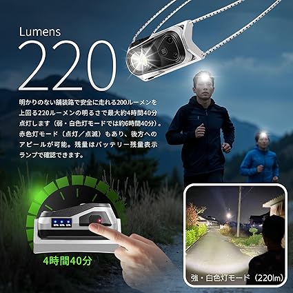 灯りのない舗装路で安全に走れると言われる200ルーメンを上回る220ルーメンの明るさのXPG-LEDで最大約4時間40分点灯します(弱白色灯モードでは約6時間40分)。揺れが少なく光源が安定し、強い灯りで遠くを照らすタイプなので暗い中での走りやすさ