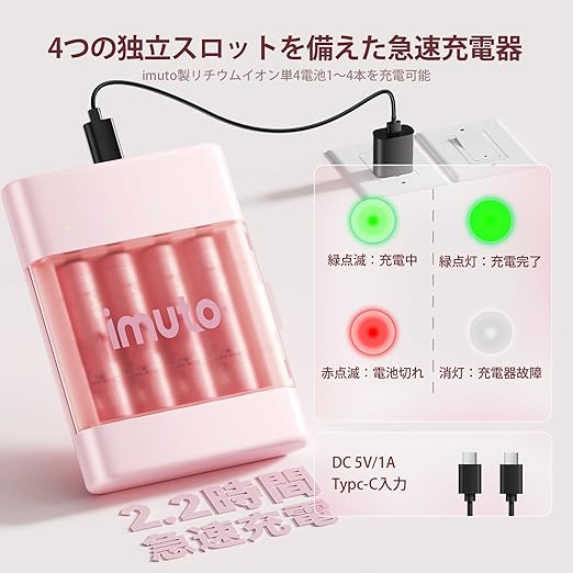 「単四リチウム充電電池」imuto 単4電池(1300mWh*4)大容量のリチウムイオン充電池は、超長待機時間で、充電して数回繰り返し使えます。電気代を節約でき、環境にも優しいです。デバイスを最適な状態に保ちます。安全保護機能が搭載されているため、充電中の安全性について心配する必要はありません。