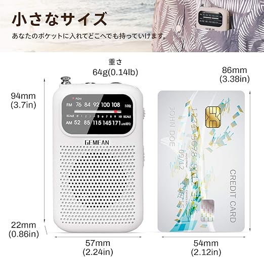 ポータブルラジオ:このポケットラジオ(94 * 57 * 22mm)、重量はわずか64g(電池を除く)。 軽くて持ち運びが簡単で、ウォーキング、キャンプ、登山などの室内での聴取や室外での活動に適しています。