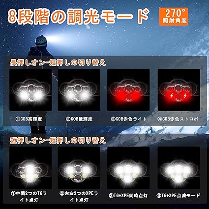 【超高輝度 LED ヘッドランプ・軽量】USB充電式(Type-C)ヘッドライトは超高輝度ledチップを搭載し、明るさは通常の小型ヘッドライト照明の約20倍です。長距離照射が可能で、夜間でも200mまでの対象物に焦点を合わせることができます。寿命は300,000時間、頑丈で耐久性が優れています。急速充電ポート搭載し、僅か3時間で完全充電となり、点灯時間は低輝度で40時間、高輝度で10時間に達ます。電池交換の手間なく充電して何度でも使えるので、経済的です。ヘッドライトの明るさは、夜の釣り、散歩や暗