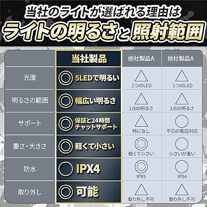 コンパクトなのにパワフル:広角ライトと望遠ライトを搭載することで、遠近両方を照らすことができます。片方だけ使用することも可能なので、利用シーンに応じて照らす範囲を変更できます。