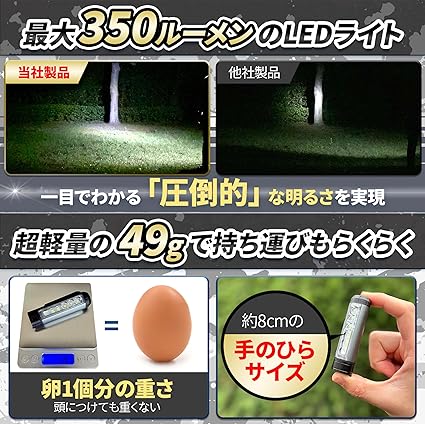 49gの卵1個分の重さ:重さはわずか49g!頭につけても重さを感じづらく、長時