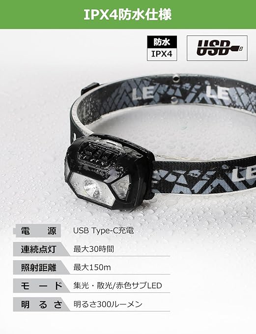 【USB Type-C急速充電・長時間点灯・IPX4防水】ヘッドランプはUSB-C充電対応で、電池交換が不要で、経済的で省エネ。満充電で、約4~30時間の連続点灯ができます。IPX4防水仕