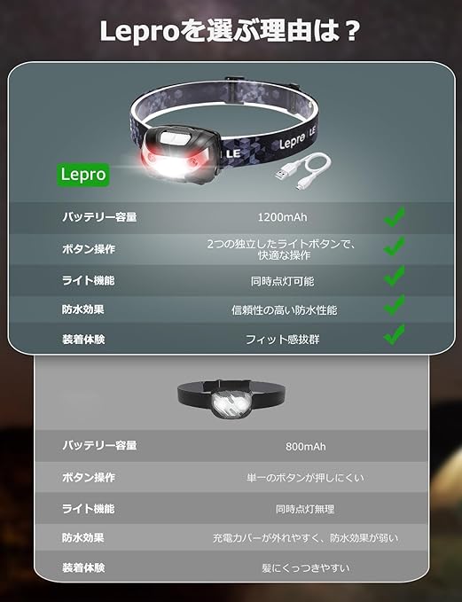 Lepro ヘッドライト 充電式 300lm高輝度 ledヘッドライト 釣り ヘッドランプ USB-C充電 登山 白&赤 ledライト【5つ点灯モード/3時間満充電/実用点灯37時間】 防水 照射角度調整可 軽量 キャンプ 散歩 アウトドア 災害 停電用 a | PCBASE