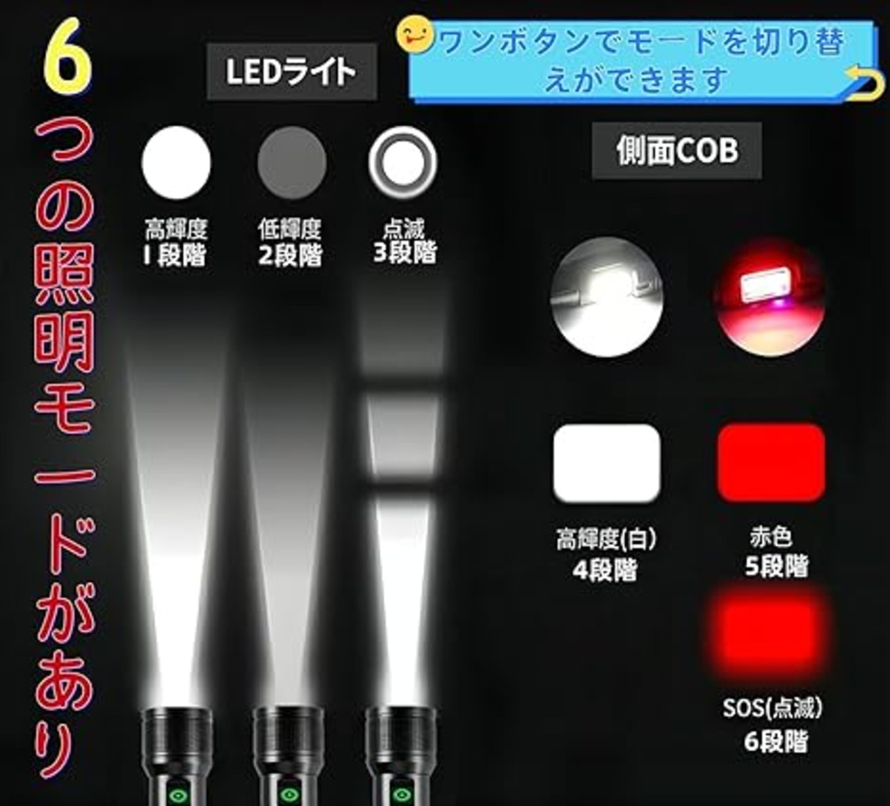 【6つの照明モードがあり、様々なシーンに対応します】キーを短押ししますヘッドライト高亮—ヘッ