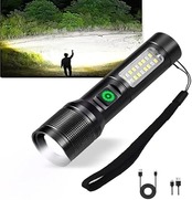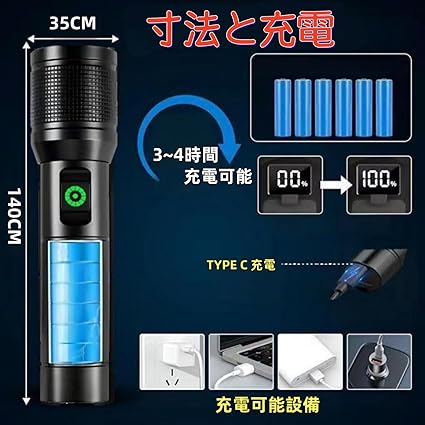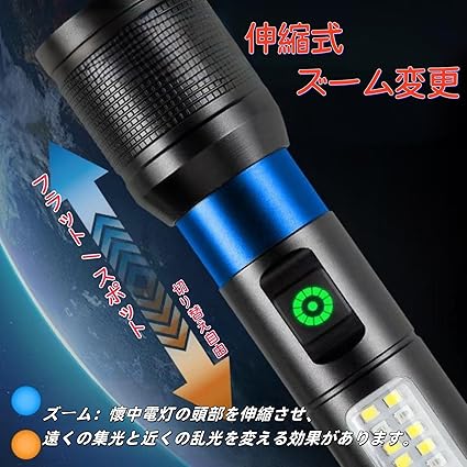 【超高輝度白色レーザー懐中電灯】新世代の本ライトは高輝度の LEDを搭載し、最大5500流明の明るさを実現。遠近両用ズーム調整機能で、シーンに合わせた最適な照明を提供します。 緊急時にはCOB赤灯の点滅でSOS信号として使用でき、安全性を向上させます。コンパクトなサイズで片手で簡単に操作できます。さらにストラップを付属しており、アウトドアなどの場合は手首に引っ掛けて持ち歩くこともできるので大変便利です。