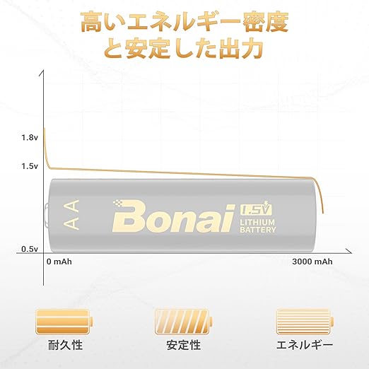 【長持ちするパフォーマンス】3000mAhの大容量を備えたこれらの新しく改良されたBONAI単3形リチウム電池は、単3形アルカリ電池よりも長持ちするため、高消費電力のデバイスに最適です。