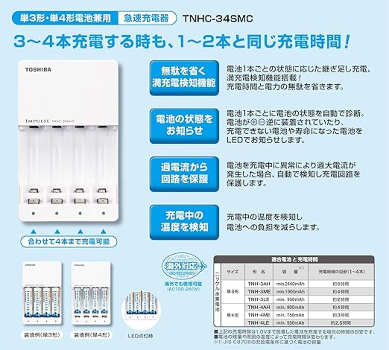 充電中の温度を検知。/ 海外でも使用可能(AC100-240V)
