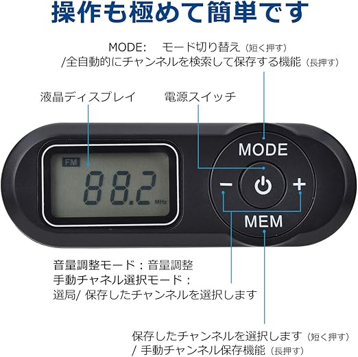「メモリー可能・オートスキャン機能」抜群なチップを採用し、20個のラジオFM番組が保存でき、たくさんのラジオ番組を楽しむことができます!プリセット選局方法は下記二つあります:全自動選局して保存する(ATS機能)、手