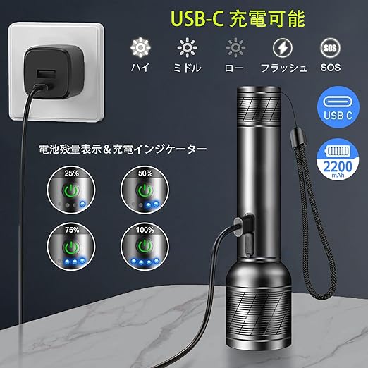【充電可能な大容量電池内蔵】LED懐中電灯 充電式は新型2200ミリアンペア充電池を提供しており、市