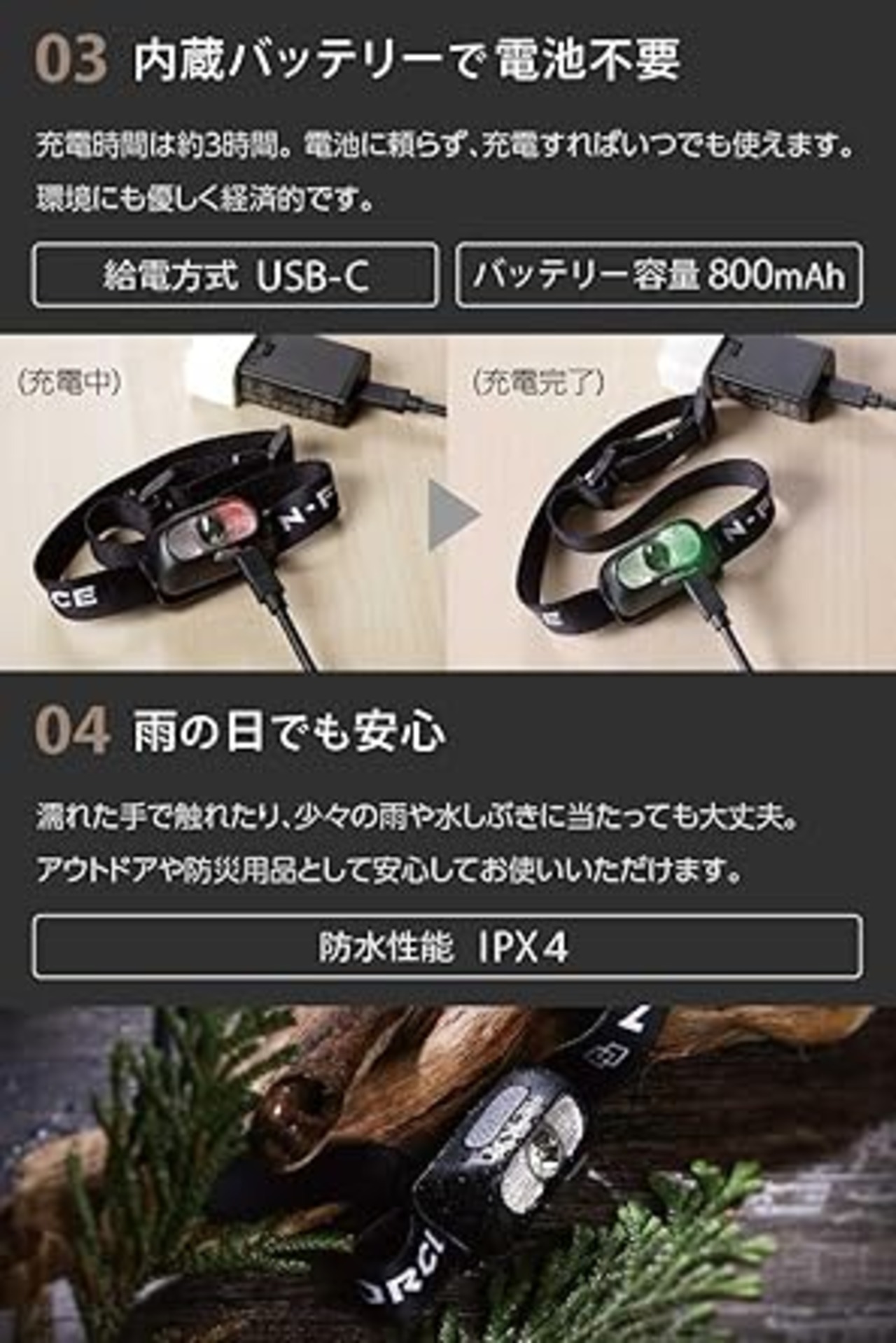 【軽量コンパクト】充電式LEDヘッドライトの中でも最軽量 53g(内蔵バッテリー込)長時間の使用でも疲れません。