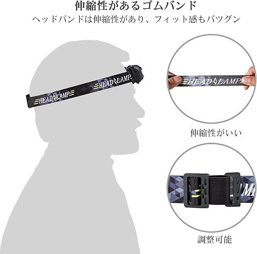 【防水&軽量】:防水性能はIPX4です。小雨、生活の水滴、飛沫や噴霧ほどの水は、商品のお使いには影響がありません。生活防水のため、水中ではご使用頂けません。重さはわずか75gですので、頭につけても、ヘッドライトの重量はほとんど感じされません。子供でも楽に使用できます。軽量ですから、長時間の使用