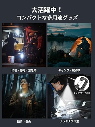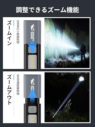 【ズーム調節式】ハンディライトはズーム調節機能が備わっており、近いから遠いまではっきり照らします。ハンディライトの前部を引くことで、ライトの照射範囲が変えます。下に引くとズームインになり、広い範囲まで照明されます。その一方、上に引くとズームアウトになり、遠距離照明