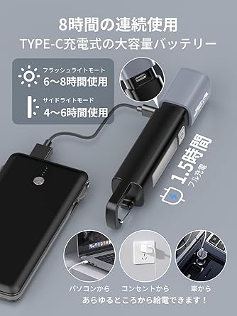 【高輝度照明モード】LEDハンドライトは高輝度XPE LED電球を搭載しており、最大照射距離は500メートルに達します。ホワイトライト、点滅ライト、サイドライトという三つの照明モードがあり、様々なニーズを満たす十分な照明を提供します。