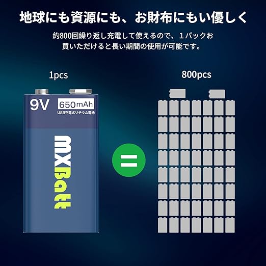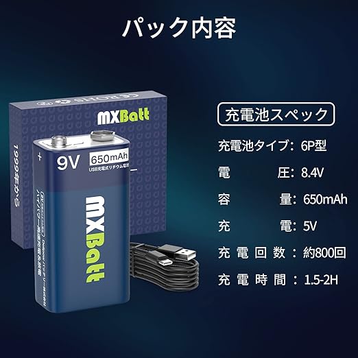 【バッテリー仕様】電圧:8.4V 容量:650mAh パック内容:リチウムイオン9V充電池x1、 充電用USB Type-Cデュアルケーブルx1、 取扱い説明書x1。充電時間:1.5-2H 充電回数: 800回 充電電圧:5V。