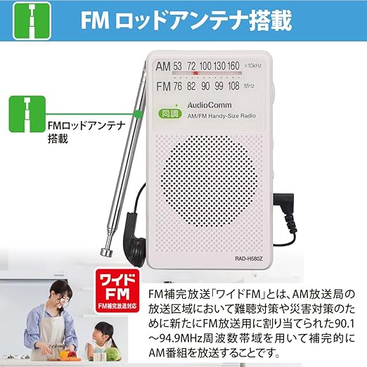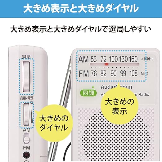 【 特 長 】 ◆大きめ表示と大きめダイヤルで選局しやすい ◆ワイドFM(FM補完放送)対応 ◆光る同調ランプ付 ◆スピーカー搭載 ◆FMロッドアンテナ搭載 ◆片耳モノラルイヤホン付属 ◆本体カラーはホワイト