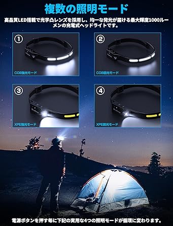 【4種の点灯モード】へっどらいとは4種の点灯モードを提供:集光高輝度,集光低輝度,散光高輝