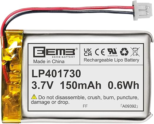基本情報-電圧:3.7V; 標準容量:150mAh、最小容量:140mAh; 重量:約2.8g; サイズ:17.5 x 31 x 4.3mm / 0.68 "x1.22" x0.17 "(WxLxH)