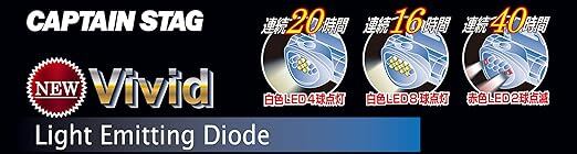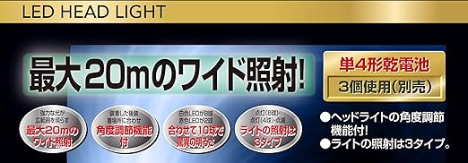 仕様:光源/LED(発光ダイオード)10個(白8・赤2)、電源/DC4.5V単4乾電池3個(別売)、電池寿命/4球・約20時間、8球・約16時間、赤色点滅・約40時間※使用状況により異なります