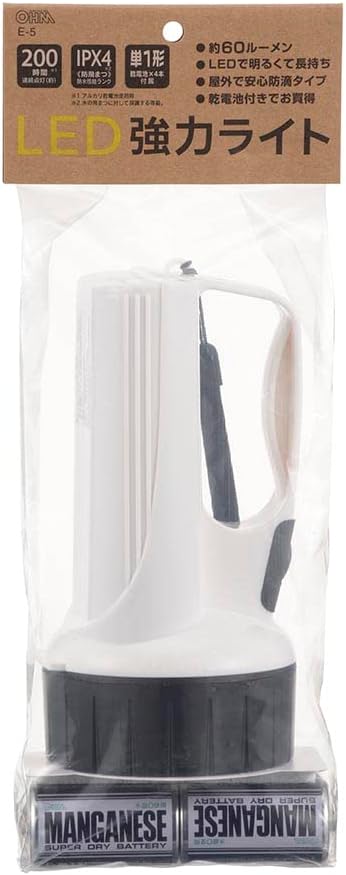 【 特 長 】 ◆明るさ約60ルーメン ◆連続点灯200時間(アルカリ乾電池使用時) ◆LEDで明るくて長持ち ◆屋外で安心防滴タイプ ◆単1形乾電池4本付属