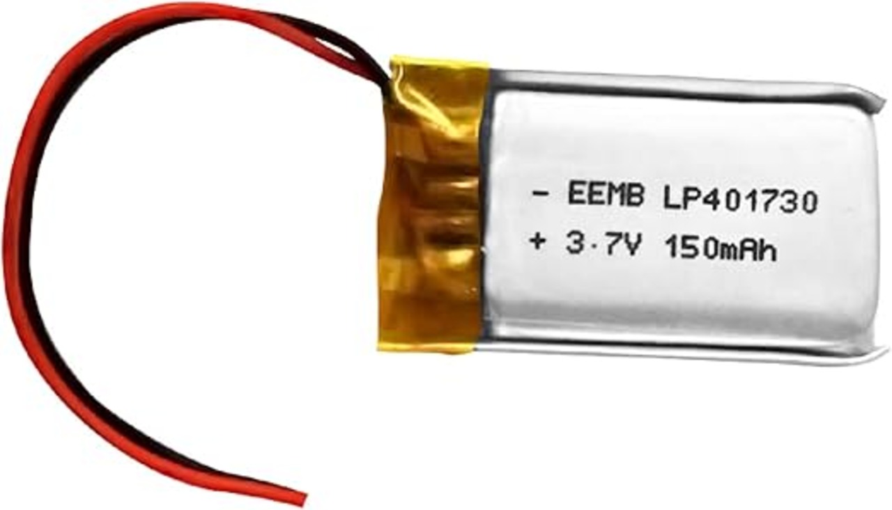 基本情報-公称容量:150mAh, 公称電圧3.7V。重量6g。充電、過電流を防ぐため保護回路が付きます。バッテリーサイズ:17.5x32x4.3mm (WxLxH)、リード線長さ50±3mm。具体的な情報はデザイン図面をご覧下さい。