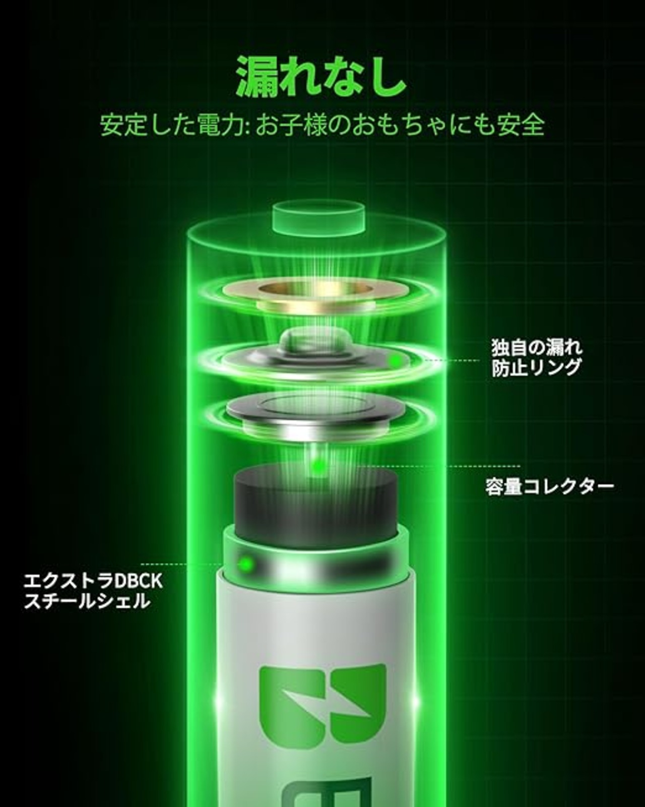 【低自己放電】低自己放電技術により、3年間充電池を放置していた場合でも75%の容量を維持できます。密閉型で液漏れ防止、低温でも寒い場所でも性能を発揮できます。