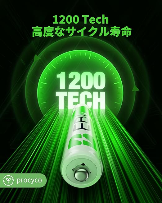 【繰り返し充電】1200回の充電を繰り返し使っても劣化が少ないです。Hg/Cd/Pdなどの有害物を使わず、エコタイプの電池です。