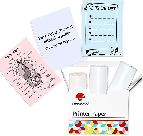 Phomemo粘着感熱紙は3ロール入りで、各ロールの幅は77mm。20年間保存可能。M03、M03AS、M04S、M04ASモデルを含むPhomemoポータブルサーマルプリンタと互換性があります。各ロールの長さは3.5メートル。