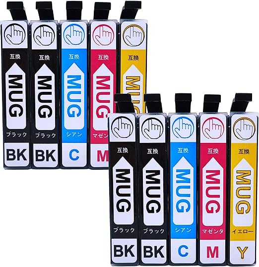 【個別包装】パッケージ内容:インク10本。ブラック(MUG-bk)4本・シアン(MUG-c)2本・マゼンタ(MUG-m)2本・イエロー(MUG-y)2本 合計10本パック ※全カラー染料