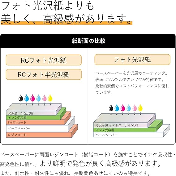 【美しい絹目調】レジンコート加工が施されているため、加工無しの通常の光沢紙と比較するとインクの吸収性と高発色性に長けています。より鮮明で発色が良く、落ち着いた絹目調の光沢が高級感を演出します。耐水性・耐久性にも優れ、長期間あせにくいため大切な写