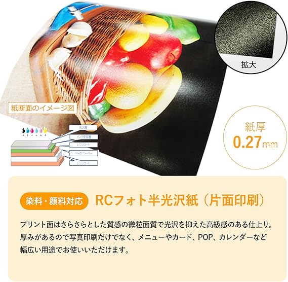 【美しい絹目調】レジンコート加工が施されているため、加工無しの通常の光沢紙と比較するとインクの吸収性と高発色性に長けています。より鮮明で発色が良く、落ち着いた絹目調の光沢が高級感を演出します。耐水性・耐久性にも優れ、長期間あせにくいため大切な写