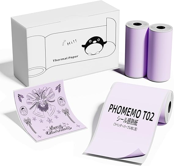純正感熱ロール紙- Phomemo T02 粘着カラー感熱紙 50mm*3.5m/ロール、1箱3ロール、ブラックテキスト ラベンダーパープル、耐光環境で20年間印刷内容を保持します