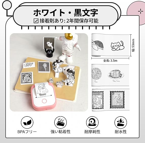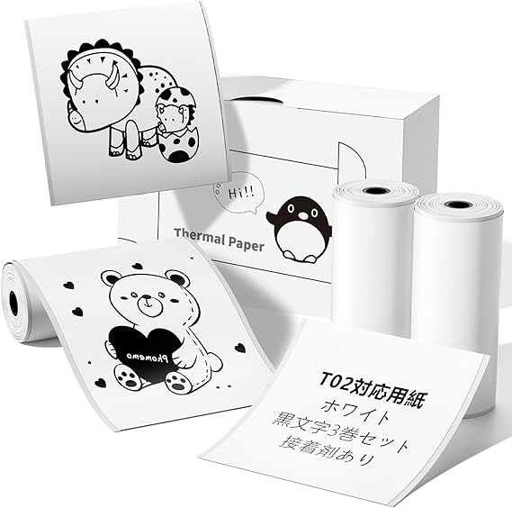 [T02 ミニプリンター用紙仕様] カラー:ホワイト(白地)。文字色:黒。粘着性:あり。幅:53 mm、全長:3.5 m。ロール数:3本。画像持続期間:2年「直射日光や多湿な環境を避け、印刷物には頻繁に触れないようにしてください。」