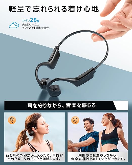 【開放型骨伝導・耳を塞がず&超軽量デザイン】弊社の骨伝導イヤホンは、鼓膜ではなく骨を振動させて音を聴覚神経に伝える新しいタイプのイヤホンです。これにより、耳を塞ぐことなく音楽を楽しむことができ、長時間使用しても耳が痛くなることなく快適に過ごせます。特に、ランニングや筋トレ、家事、テレワークなど、動きながら音楽を楽しむ「ながら使い」に最適です。耳をふさがずに、周囲の音(車の音や信号音など)をしっかりと聞き取ることができるため、特に安全性が求められるシチュエーションでも安心して使用できます。例えば、