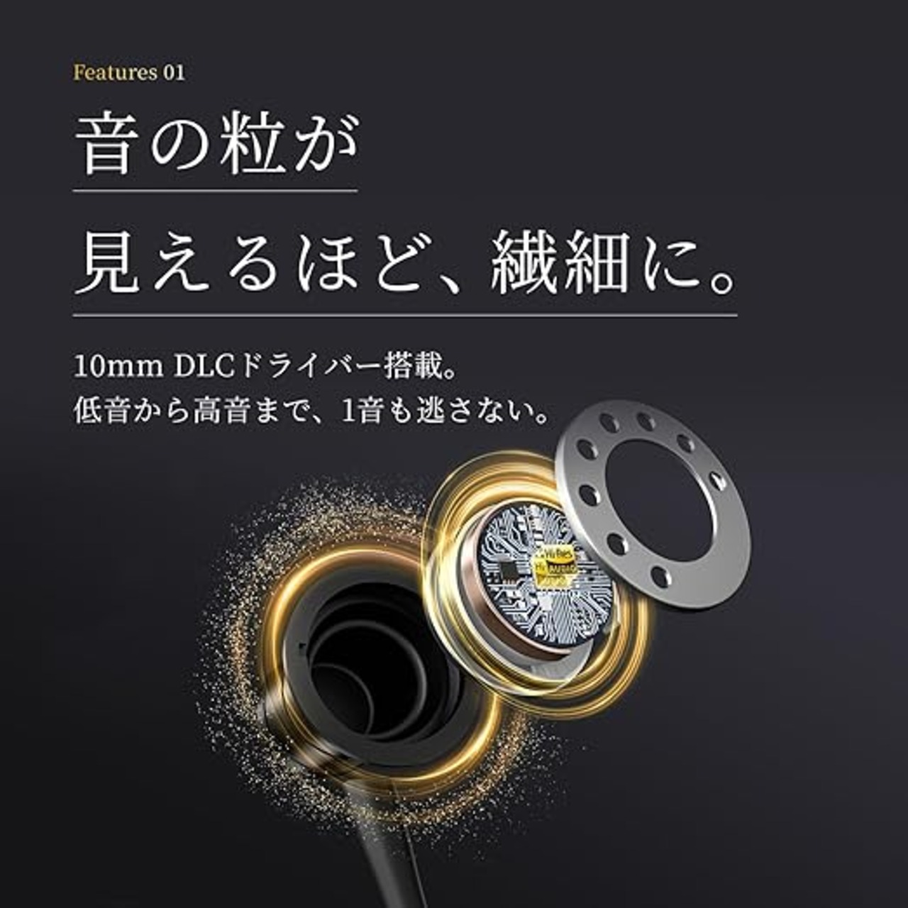 【DLC振動板採用 10mmダイナミックドライバー】 10mmドライバーに搭載されたDLC(ダイヤモンドライクカーボン)振動板が、豊かな低音と繊細な高音を両立。小型ながら迫力あるサウンドで、音楽のディテールを余すことなく再現します。