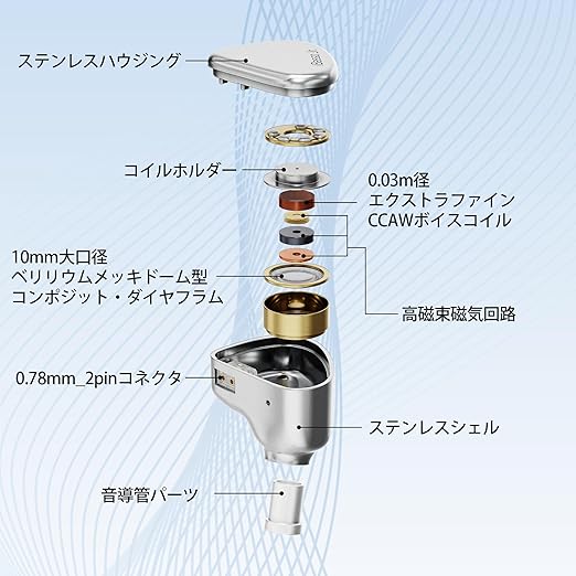 【ハイスタンダードクオリティ、先進的なエントリーモデル】GELATOのフラッグシップクラスにも匹敵する、ベリリウムメッキドーム型コンポジット・ダイヤフラムと、ヘルムホルツ共鳴デュアルチャンバーテクノロジーを採用することで、優れたサウンドを生み出す基礎となっています。 そして、ステンレス製筐体は、手触りが滑らかで剛性・質感共に優れたクオリティを実現しており、GELATOはサウンド・デザインの双方を高い水準で再現することを叶えたイヤホンです。
