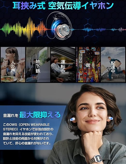 新世代新時流のOWSイヤホンが登場!!最高傑作!指向性空気伝導技術と超強技術を組み合わせたBluetoothイヤホンです。伝統式ワイレスイヤホンと従来型のBluetoothイヤホンが限界突破!「OWSイヤホン選ぶ理由」OWS(Open Wearable Stereo)はチップ技術とアルゴリズムの進化、そして動的監視と計算によって複数の音源を合成し、音を再配置しています。 また、従来型のBluetoothイヤホンと比べて、より良い音質をもたらすだけでなく、聴力を損なうリスクがありません。 「おしゃ