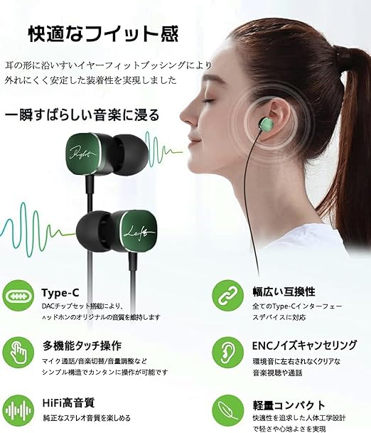 Ayoii【日本国内販売限定 2025年NEWモデル] タイプc イヤホン 有線 USB-C有線 Type C イヤホン HiFi マイク付き 通話可能 音量調節 ヘッドホン イヤフォン カナル型 ステレオ 音漏れ防止 ノイズ軽減 Type Cインターフェース使用 対応iPhone17/iphone16,15/iPad/Xperia/Galaxy/Android (ダークグリーン) a | PCBASE