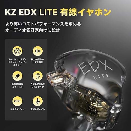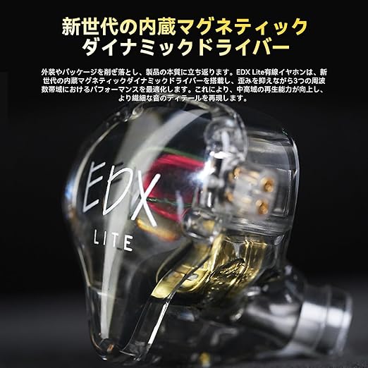 【スーパーニアダイナミックドライバーユニット】KZ EDX Lite有線イヤホンは、新世代の内部磁気ダイナミックドライバーを備え、3周波数パフォーマンスを最適化しながら歪みを低減します。 これにより、より詳細な中高周波パフォーマンスを提供し、より複雑な音のディテールが再現されます。 このドライバーユニットは、共振ピークの位置をより正確に制御するための新しい内部キャビティでアップグレードされています。 さらに、新しいダンピングソリューションも実装され、生産の一貫性が向上しています。