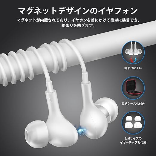 マグネットデザインのイヤフォン、収納ケースも付き:二つのイヤホンの背面にマグネットが内蔵されてお