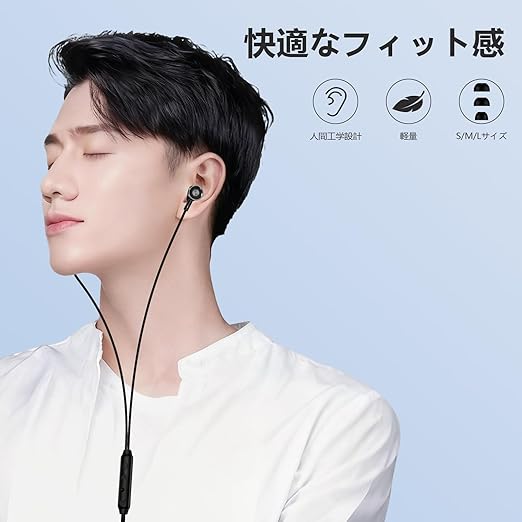 【装着感抜群】 人間工学に基づいたインナーイヤー型デザイン、しっかり耳にフィットし、どこでも音楽を楽しむことができる。また、多機能リモコンとマイク付きなので、音楽再生&一時停止、通話&通話終了&通話拒否ができます。イヤーピースは耳