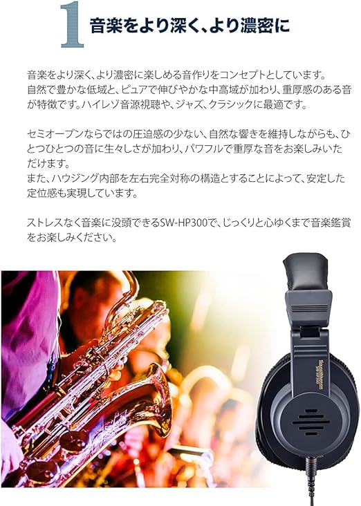 [SW-HP300 セミオープン エアー ダイナミック ヘッドホン]軽快さと中高音域の明瞭度や透明感の高さを重視したSW-HP100に対し、音楽をより濃密に、より深く楽しめる音作りをコンセプトに開発しました