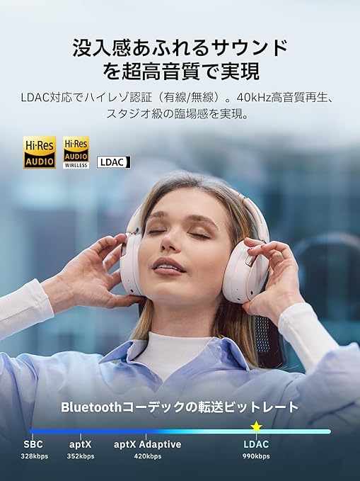 【さらにアップグレードされ、80時間連続再生可能】モデル改良により、ANCオフ時の連続再生時間が55時間から80時間にアップしました。急速充電にも対応しており、15分の充電で13時間の再生が可能です。連続再生時間が45時間(ANCオン)以上で、移動や外出中でも安心して使用可能です。