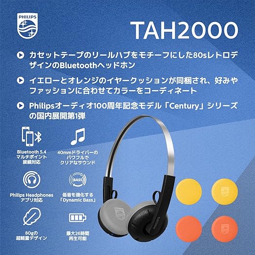 PHILIPS(フィリップス) TAH2000 RINGO オンイヤー Bluetooth5.4 ワイヤレスヘッドホン Philipsオーディオ100周年記念モデル 80sレトロデザイン マルチポイント接続対応 交換用カラーイヤークッション同梱 アプリ対応 最大26時間連続再生 急速充電対応 メーカー保証1年間 (ブラック) a | PCBASE